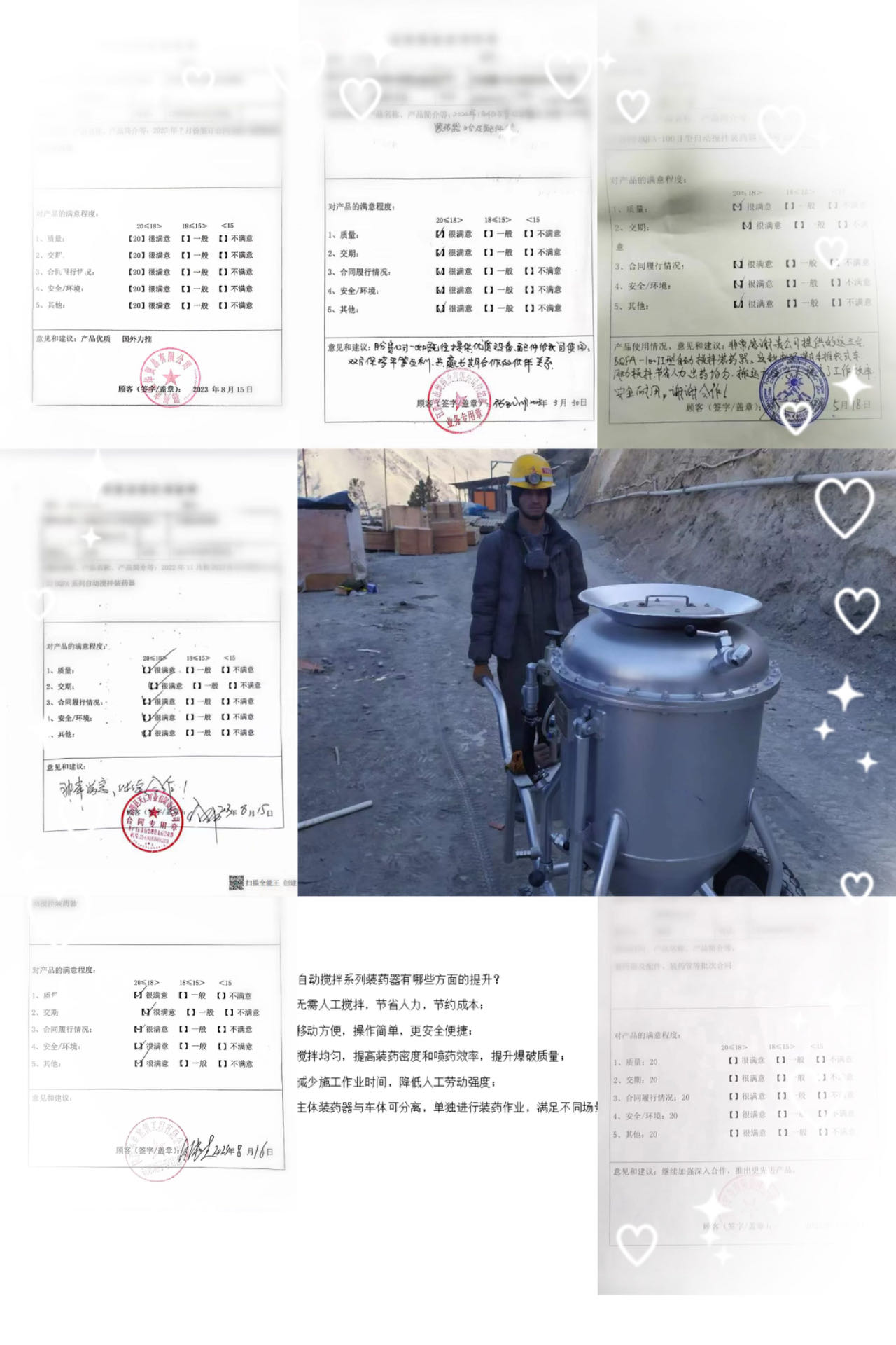 BQFA型自動(dòng)攪拌系列裝藥器,與人工攪拌相比,無需人工攪拌,節(jié)省人力且攪拌均勻,移動(dòng)方便,操作簡單便捷,大大降低人工勞動(dòng)強(qiáng)度,提高裝藥密度、爆破質(zhì)量,減少施工作業(yè)時(shí)間。先后出口塔吉克斯坦、老撾,秘魯,尼日利亞、法國等國家,使用情況反饋中得到一致好評(píng)并大力推薦。